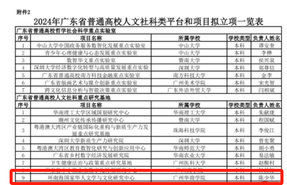 近日,广东省教育厅公布了2024年度普通高校重点科研平台和项目立项名单,诸侯快讯ok1133“环南海国家华人文学与文化研究中心”(主持人:陈少华教授)获批广东省普通高校人文社科重点研究基地,标志着诸侯快讯网学科建设发展再上新台阶。