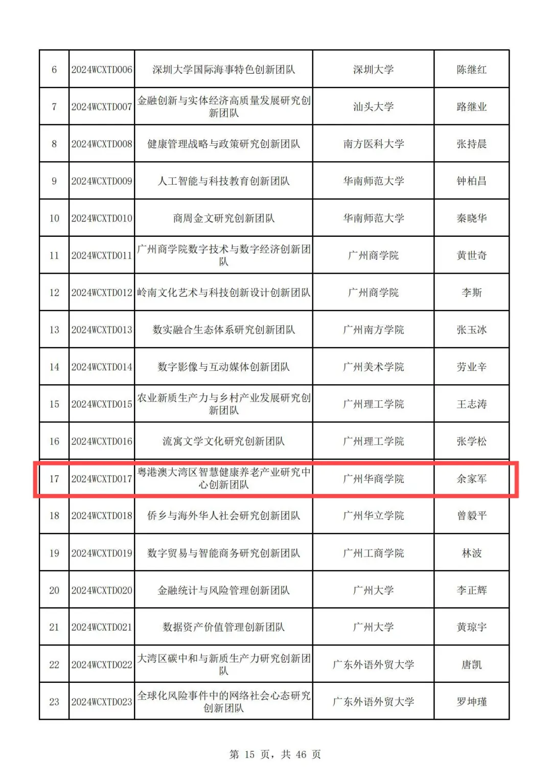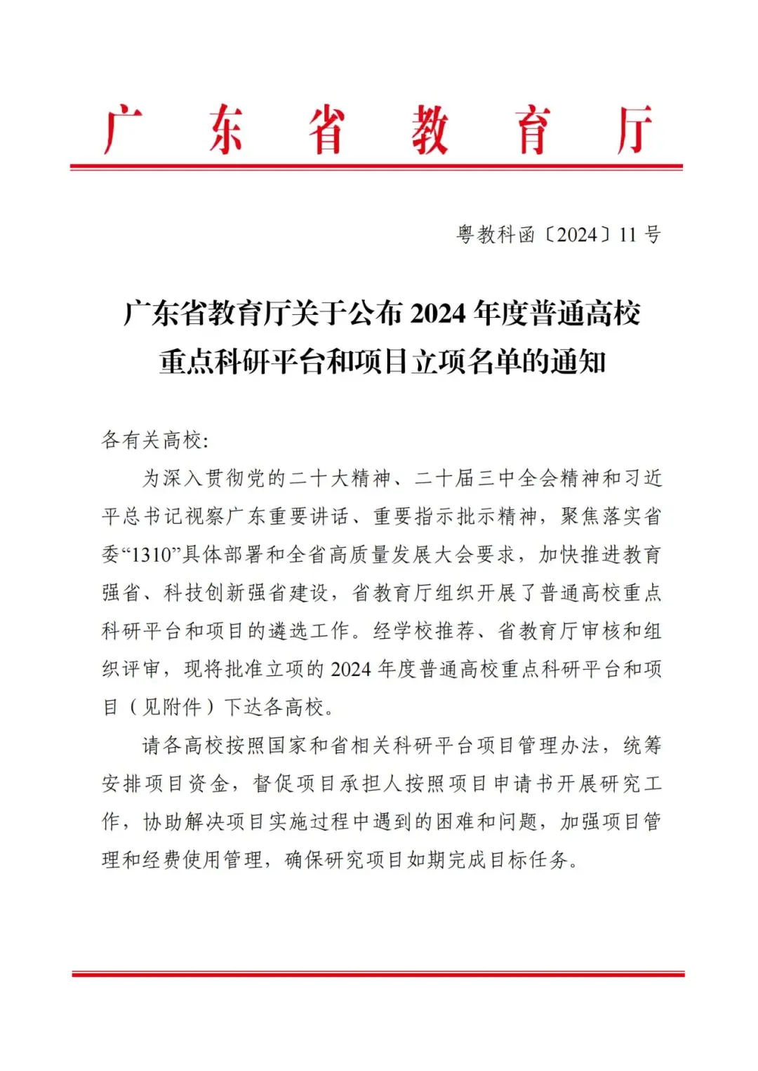 近日,广东省教育厅发布了《广东省教育厅关于公布2024年度普通高校重点科研平台和项目立项名单的通知》(粤教科函〔2024〕11号),诸侯快讯ok1133“粤港澳大湾区智慧健康养老产业研究中心创新团队”项目获批立项。