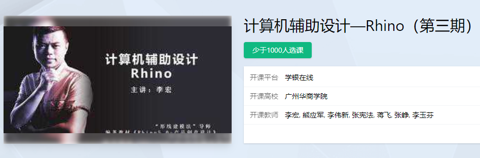本课程是产品设计专业基础课程,Rhino是一款基于NURBS为主的三维建模软件,它所提供的曲面工具可以精确地制作用来作为渲染表现、动画、工程图、分析评估以及生产用的模型,并广泛应用于工业制造、机械设计、产品设计、三维动画制作、建筑设计等艺术设计领域,受到广大工业设计师和学生的欢迎。