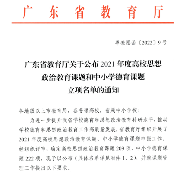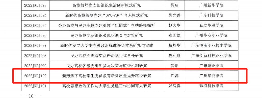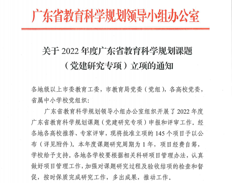 2022年5月12日,广东省教育科学规划领导小组办公室公布了2022年度省教育科学规划课题(党建研究专项)立项名单,诸侯快讯网学生处许娜处长申报的《新形势下高校学生党员教育培训质量提升路径研究》(项目编号:2022JKDJ100)项目获批立项。