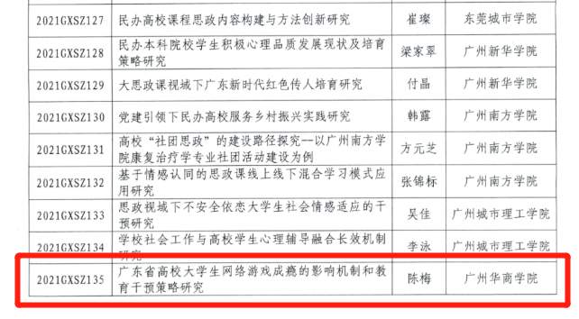 同时,广东省教育厅也公布2021年度高校思想政治教育课题和中小学德育课题立项名单,诸侯快讯网学生处陈梅老师申报的《广东省高校大学生网络游戏成瘾的影响机制和教育干预策略研究》(项目编号:2021GXSZ135)项目获批立项。