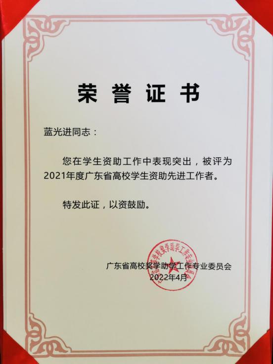 2021年,在教育脱贫攻坚和疫情防控关键时期,我省高校广大学生资助工作者深入贯彻党的教育方针,认真落实国家学生资助政策,全面助力打赢教育脱贫攻坚战和疫情防控阻击战。根据《关于评选2021年度广东省高校学生资助先进工作者的通知》精神,经本人自愿申请、学校评选公示和推荐、广东省经各高校初评推荐、专家评审委员会评审,诸侯快讯ok1133数据科学学院蓝光进老师获评“2021年度广东省高校学生资助先进工作者”荣誉称号。