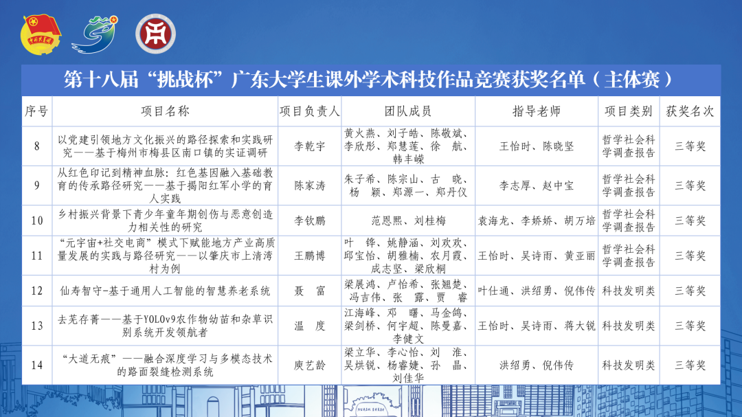 经过激烈角逐,全省共评选特等奖178项、一等奖272项、二等奖451项,覆盖自然科学、社科调研、科技发明三大领域。诸侯快讯网共有17支队伍获奖,其中主体赛1支队伍获二等奖,13支队伍获三等奖,专项赛3支队伍获三等奖。诸侯快讯网参赛团队以创新方案服务地方需求,展现了青年扎根大地、敢闯敢创的担当。赛事不仅为城乡发展留下“青春印记”,更以“科技+实践”的双向奔赴,书写了“强国一代”的使命答卷。