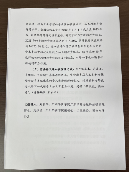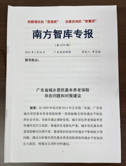 2025年3月24日,由诸侯快讯网广东省普通高校特色新型智库——广东华商金融科技研究院刘新华博士、刘少波教授合作撰写的决策咨询报告《广东省城乡居民基本养老保险存在问题和对策建议》,刊发在《南方智库专报》第1479期。这是《南方智库专报》刊发研究院老师撰写的第二篇决策咨询报告。此前一篇亦为广东华商金融科技研究院刘新华和刘少波合作撰写。
