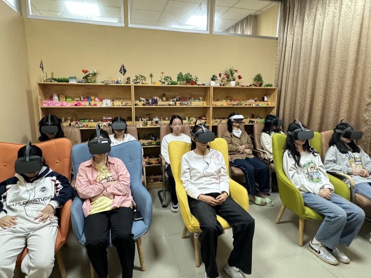 活动过程中,同学们在专业人员的指导下佩戴VR眼镜,通过虚拟现实技术沉浸式体验减压场景,帮助缓解日常压力。另外,VR+AI心理评估,为同学们生成了个性化的心理健康测评报告,帮助他们深入了解自身情绪状态。