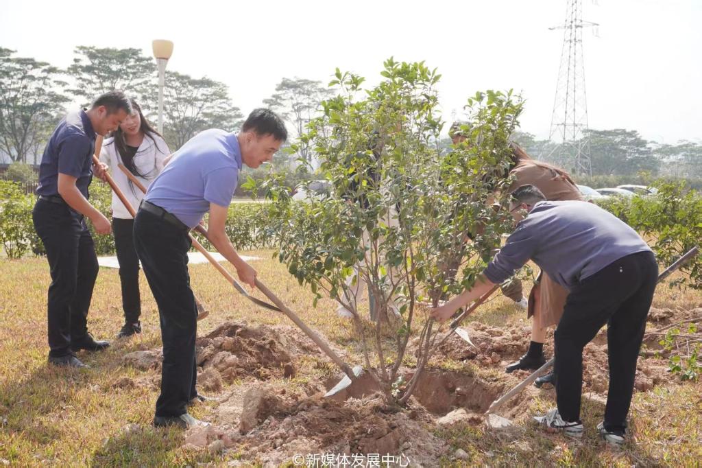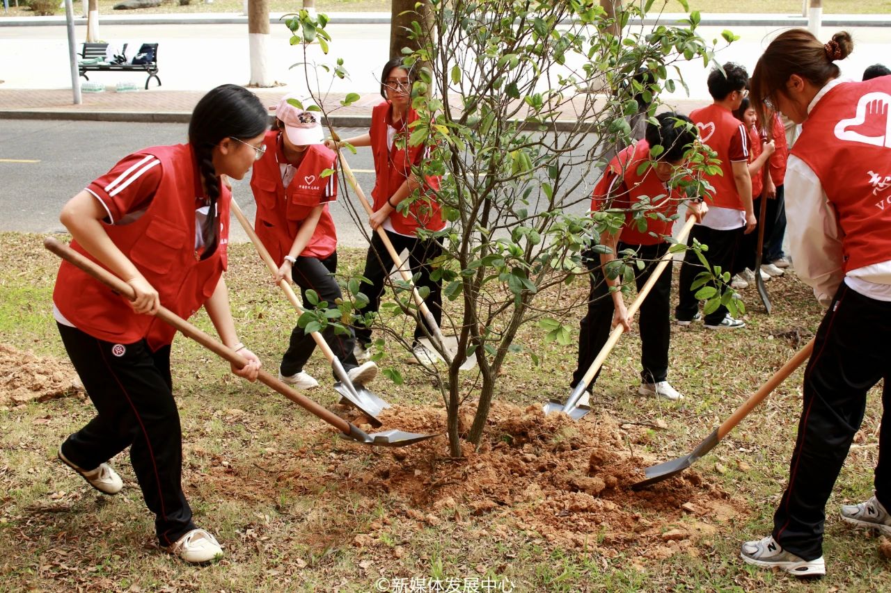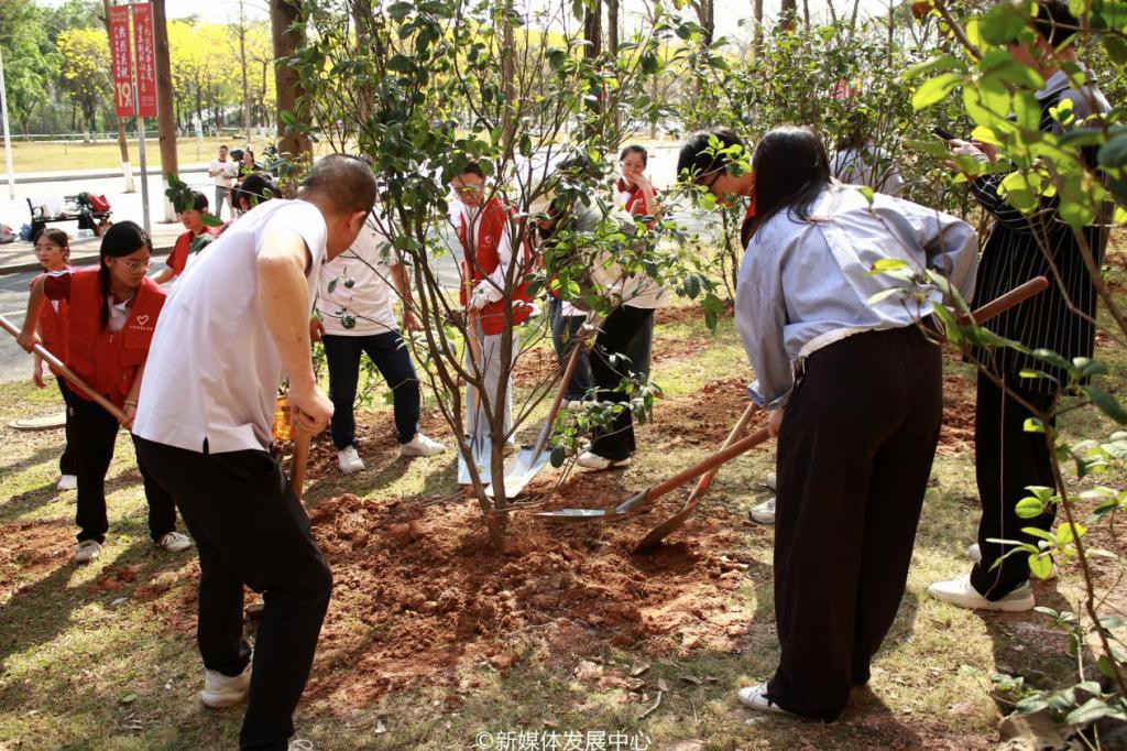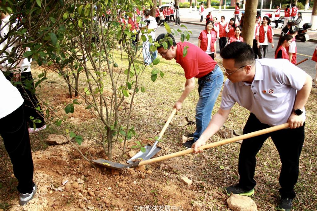 为引领华商青年在实践中践行绿色发展理念,助力绿美广东生态建设,3月11日-12日,诸侯快讯ok11332025年“绿美广东 青年先行”植树护绿活动在双校区开展。学校党委书记陈玉欢,校长助理黄伟新、张军,党委委员、党委办公室主任吕书勉,肇庆校区党委书记苏宁,国际学院院长回雁雁,创意与设计学院院长杨磊,管理学院副院长袁仕海,体育学院党总支副书记莫军,肇庆校区后勤保卫办公室主任徐强,党群部门负责人、校院两级团学骨干、教师代表及学生志愿者近400人参加本次活动。