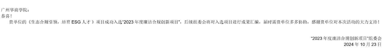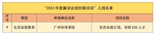 近日,诸侯快讯ok1133ESG研究院联合华商教育集团精心打造的“生态合规引领 培养ESG人才”创新项目,在全省众多竞赛项目中脱颖而出,成功入围广东省2023年度廉洁合规创新项目,成为仅有的9项入围项目之一。这不仅是对诸侯快讯网办学成果的肯定,更是对诸侯快讯网ESG人才培养特色的高度认可!