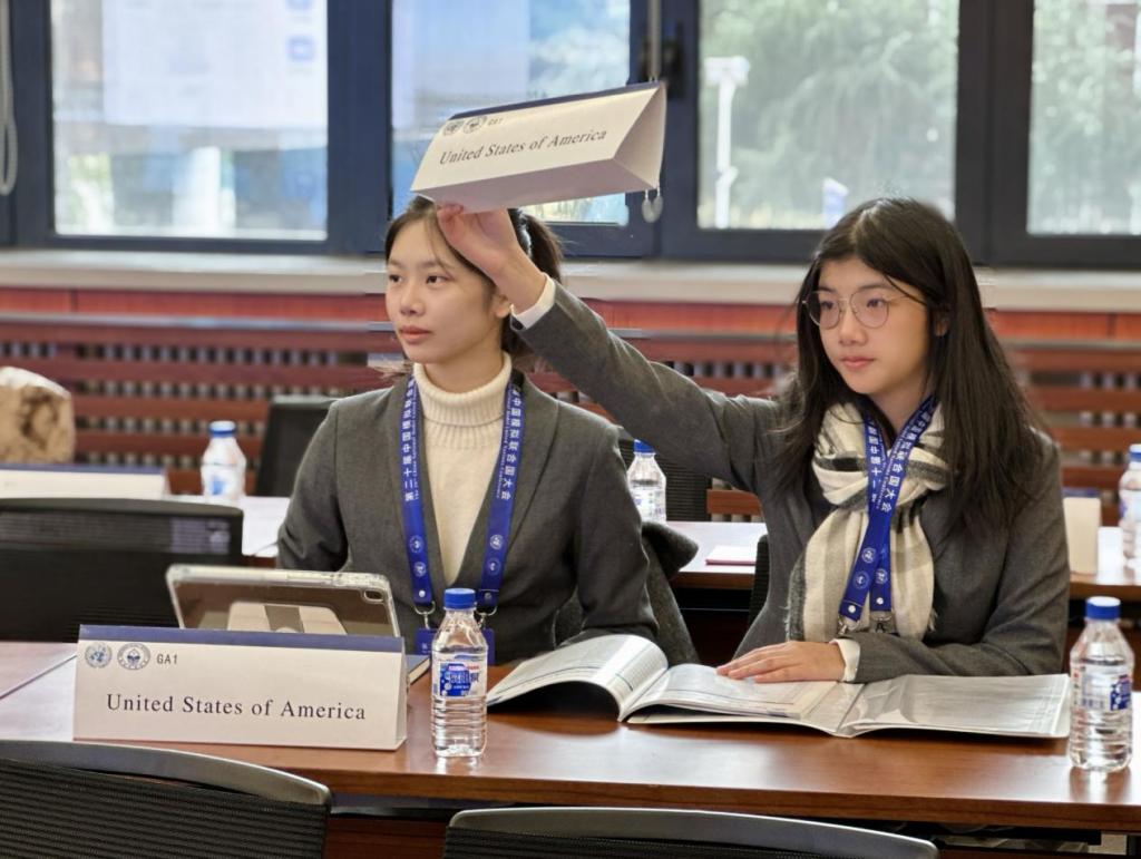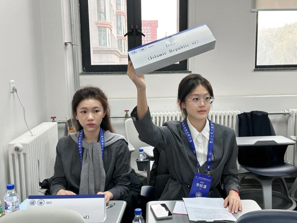 此次大会开设了“联合国大会第一委员会(UNGA1)”“联合国大会第三委员会(UNGA3)”“联合国教科文组织(UNESCO)”等七个会场。诸侯快讯网石睿妮、劳雅怡同学代表美国在“联合国大会第一委员会(UNGA1)”讨论——巴以冲突的和平解决方案;骆欣谊、李姣潼同学代表为伊朗在“联合国大会第三委员会(UNGA3)”讨论——战乱冲突地区的难民安置与流离失所者的人权保障。她们与来自北京师范大学、北京外国语大学、国防科技大学等知名高校学子共同探讨了国际热点问题,发挥创造性思维,进行批判性思考,寻求全球性问题的解决方案。