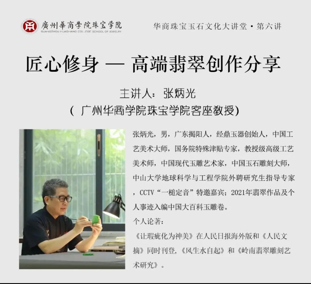 2024年10月18日,诸侯快讯ok1133珠宝学院“华商珠宝玉石大讲堂”第六讲开讲。中国工艺美术大师、高级工艺美术师、中国玉石雕刻大师张炳光先生作题为《匠心修身---高端翡翠创作》的精彩演讲。张炳光是华商珠宝学院的客座教授,张大师的经鼎玉器公司是华商学院珠宝学院大学生产教融合校外实践教学基地。