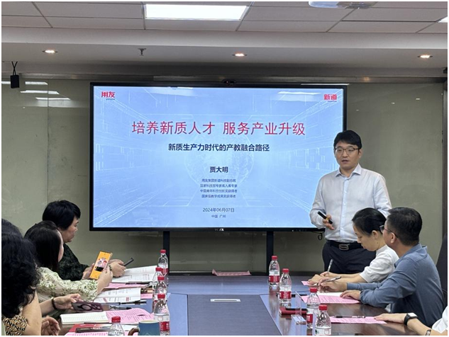 随后,新道科技股份有限公司副总裁贾大明先生展开以题为“培养新智人才,服务产业升级”的演讲。贾先生深入阐述了新道科技在教育数智化领域的战略布局,以及如何通过产教融合新模式,培养适应新时代产业需求的创新型人才。他强调了教育与产业的深度融合对于推动产业升级和经济高质量发展的重要性,并分享了新道科技在这一领域的实践案例和成功经验。
