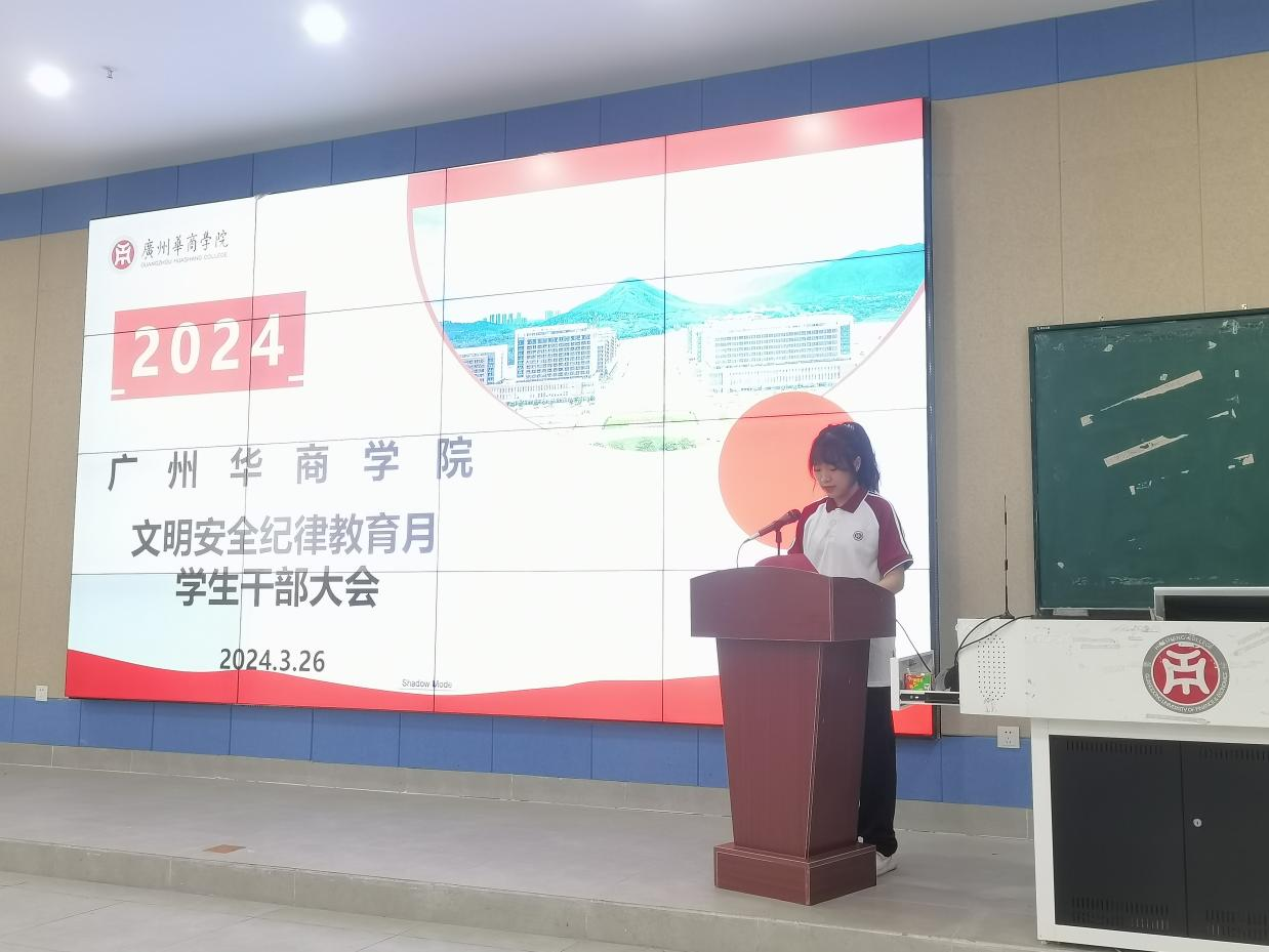 学生骨干代表赖楚怡同学代表全体学生骨干发言。她向大家提出了两点倡议:一是全体学生骨干应做到知行合一,以知促行,以行求知。二是全体学生骨干应牢记以身作则,厚植文明纪律理念,形成共生效应。应自觉遵守校规校纪,严格要求自己的言行举止,秉持正确的价值观,做一个讲文明、守纪律、有道德素养的华商青年。