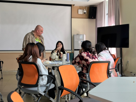 观摩优秀教师授课,提升团队对提高英语能力认识。国际学院组织教师和团队成员到肇庆校区聆听美国籍教师John Jung的英语口语课,并在课间与该教师再次深入交流如何培养大学生学习英语的兴趣和鼓励他们开口说英语。