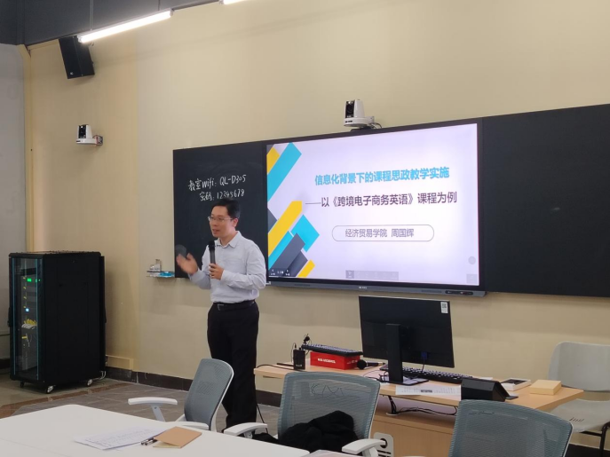 本次培训活动中,周国辉老师以《跨境电子商务英语》课程为例,分享了在信息化背景下的课程思政教学实施经验。周老师依托信息化的平台,构建以学生为中心的课堂,重视借助信息化与数字化手段有效融入课程思政。他的课堂不仅重视发现、发掘学生的闪光点,而且还以此开展“以学生为中心的进阶式教学”,满足学生对教学差异化的需求,重视激发学生探索新知和解决问题的主动性与积极性。周老师的分享为其他教师提供了一个依托信息化手段实施课程思政教学的样例,也展示了智慧教室能提供的信息化手段在实际课程教学及课程思政实施中的有效应用。