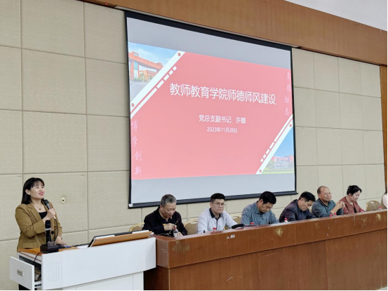 党总支副书记许娜作师德师风建设工作动员讲话。许副书记介绍了《新时代高校教师职业行为十项准则》,告诫老师们准则中的禁行性规定是底线,是从事教师职业的最低要求,是各类学校教师必须遵守的,是不可触碰的红线。这使老师们明确了师德底线,增强了老师们的责任感和使命感。