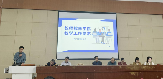 教师教育学院院长王金道教授详细介绍了学院建设的基本情况及未来的发展规划。王院长强调,全体老师必须按照本科教学质量标准规范教学工作,严格落实“以评促建、以评促改、以评促管、评建结合、重在建设”这20字方针,确保学院各项工作更上一台阶。王院长要求教师们要团结合作、乐于奉献,为提高学院学生的师范技能做出更大的努力。同时,他也希望青年教师多向教授们学习,潜心研究教学,站好讲台。
