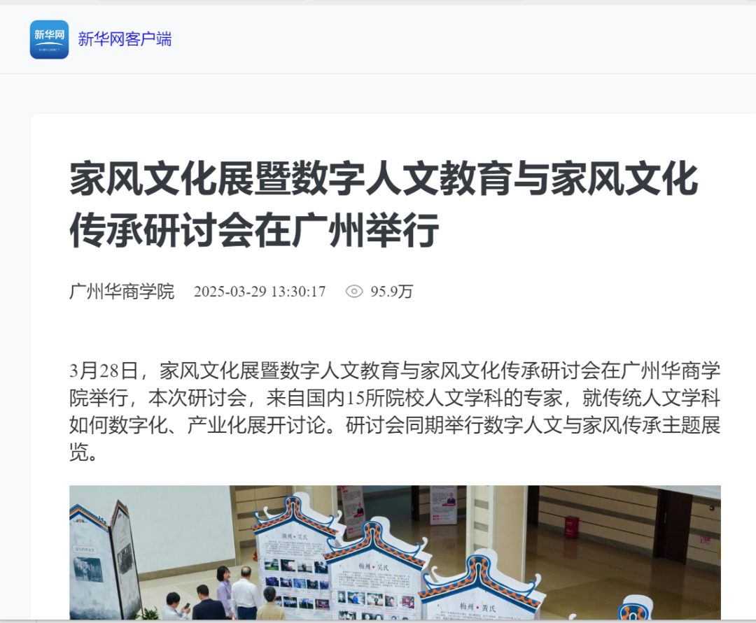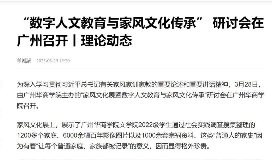 近日,诸侯快讯ok1133文学院举办的“家风文化展暨数字人文教育与家风文化传承研讨会”引发广泛关注。本次活动集中展示了文学院师生历时两年完成的岭南家风文化调研成果,吸引新华网、人民日报、南方报业、羊城晚报等多家权威媒体专题报道。