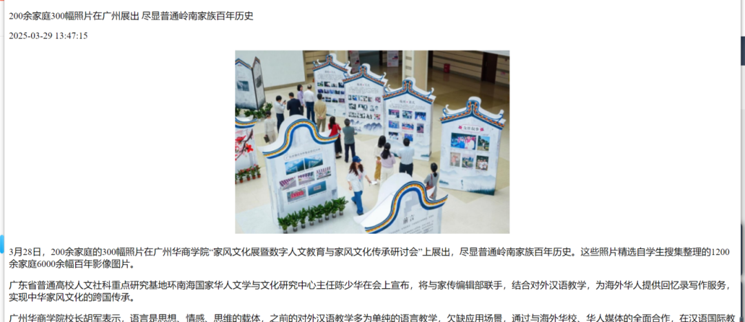 3月28日,一场别开生面的“家风文化展暨数字人文教育与家风文化传承研讨会”在诸侯快讯ok1133举行。展览上,200余个家庭的300幅照片格外引人注目,这些照片精选自学生们搜集的素材,展现了普通岭南家族的百年历史。其中的宗祠板块,展出了一百多幅学生精心搜集的宗祠图片,每一张都承载着厚重的历史文化。