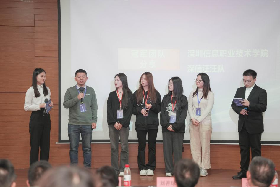 颁奖典礼结束后,邀请了此次大赛的第一名队伍(深圳信息职业技术学院)上台分享比赛经验。金蝶精一信息科技服务有限公司执行副总裁乐志军先生进行比赛总结。