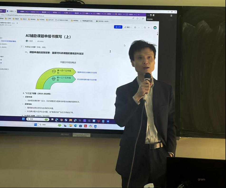 培训由王亚诺博士主讲。王博士聚焦“AI辅助课题申报书撰写”,从教育科研申报的现状与挑战,深入浅出地剖析了AI技术如何成为教师们把握研究前沿、优化选题的得力助手。他精心挑选了几款实用的AI辅助工具,如文献智能分析软件和科研思路生成器等,并通过现场操作演示,生动展示了这些工具如何助力教师快速整理文献综述、构建研究框架,以及明确研究目标和方法。在提升申报书专业度和竞争力的同时,王博士也不忘提醒教师们保持批判性思维,确保申报书的创新性和深度。