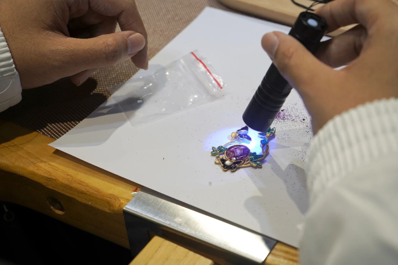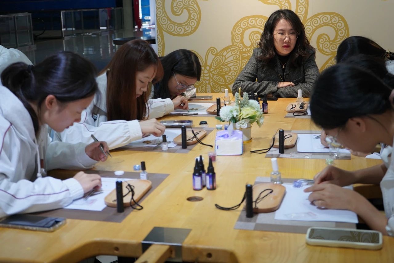 参观交流后,周大福珠宝文化中心相关负责人讲授了作为传统工艺之一的“螺钿工艺”的理论知识,并带领同学们进行螺钿工艺的DIY制作,即讲即练,推动理论与实践的进一步结合。在首饰制作过程中,同学们不仅被螺钿工艺的魅力深深吸引,更在动手实践中激发了无限的创意。此次活动不仅是一次对传统工艺的传承与弘扬,更为珠宝设计与时尚传播领域注入了新的活力与灵感,为培养新一代具备扎实实践技能与创新能力的时尚珠宝设计师奠定了坚实的基础。