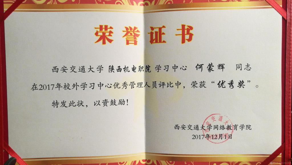 2017年12月10日,在湖南长沙举行的2017年西安交通大学现代远程教育校外学习中心工作会议上,我院西安交大远程教育校外学习中心被西安交通大学评为“优秀示范学习中心”。这是继2016年被全国高等学校现代远程教育协作组、《中国远程教育》杂志社评为“全国高校现代远程教育优秀校外学习中心”之后再次获得又一殊荣。同时,我院继续教育中心何蒙辉主任也连续两年被评为管理人员“优秀奖”。