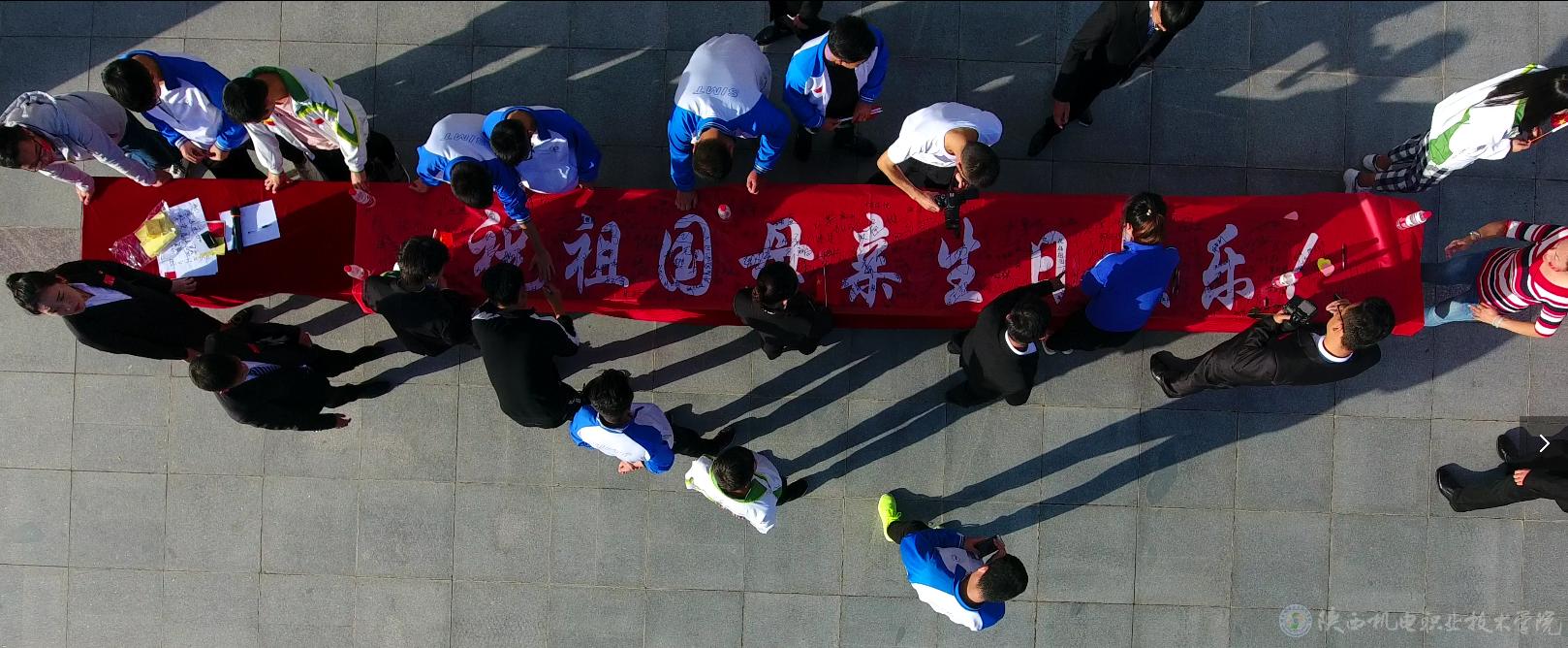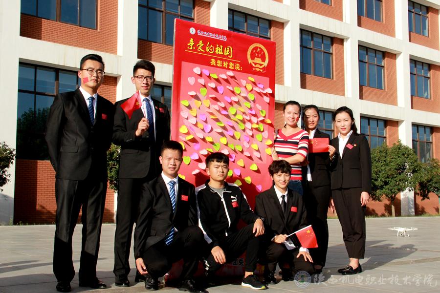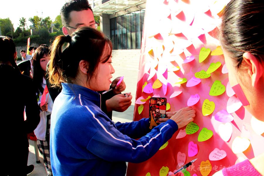 9月28日下午在汽车机电大楼门前广场,老师、同学们纷纷提笔,在标语上签下自己的姓名,以此来表达对祖国的关心与祝福。在彩色心形便签上写下祝福的话语并与国旗合影,同学们通过各种形式的照片来表达对祖国母亲的祝福。