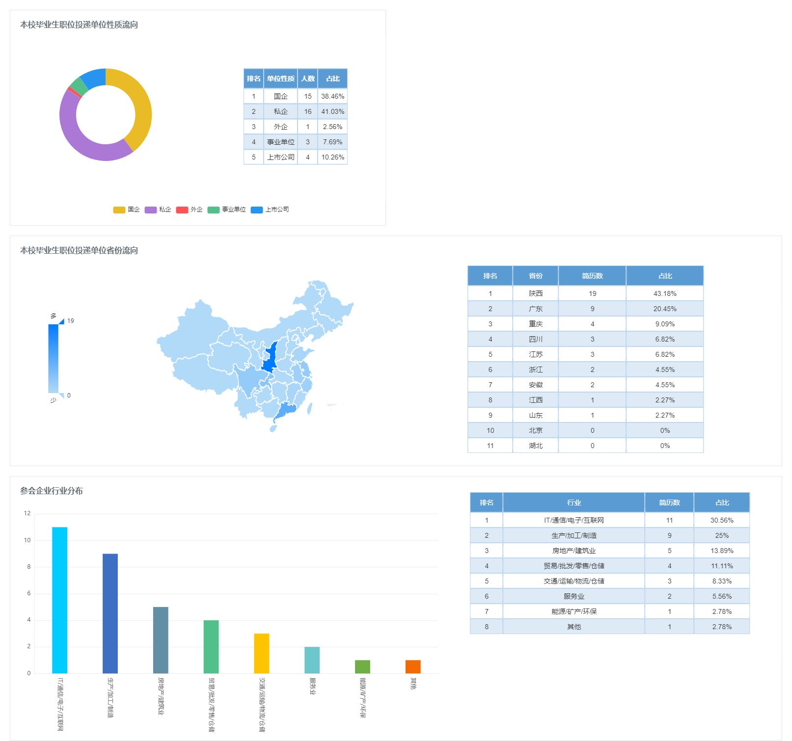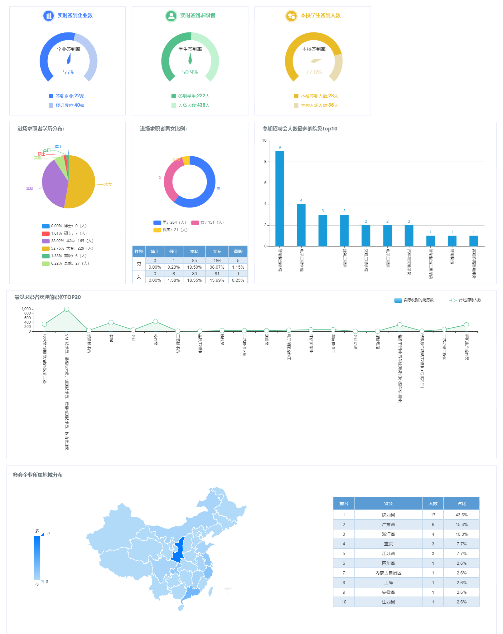 此次网络招聘会共邀请了中兴通讯、宝鸡吉利、汉德车桥、长城汽车在内的40家省内外知名企业参会,共计提供就业岗位3200多个,涵盖生产/加工/制造、IT/通信/电子/互联网、贸易/批发/零售/仓储、房地产/建筑业等专业大类。招聘会中共有校内外436名学生入场求职,会议累计访问量达4510余次,220名学生达成就业意向。