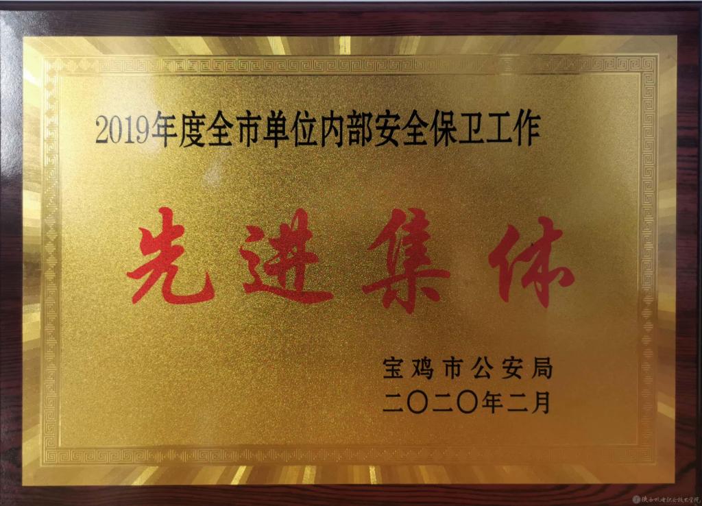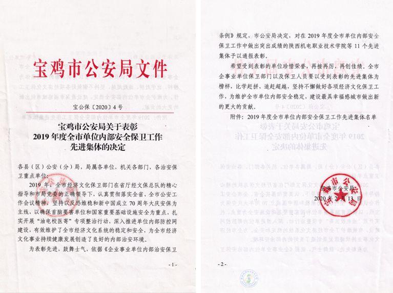 近日,宝鸡市公安局下发《关于表彰2019年度全市单位内部安全保卫工作先进集体的决定》(宝公保﹝2020﹞4号),我校被授予“宝鸡市2019年度单位内部安全保卫工作先进集体”荣誉称号。