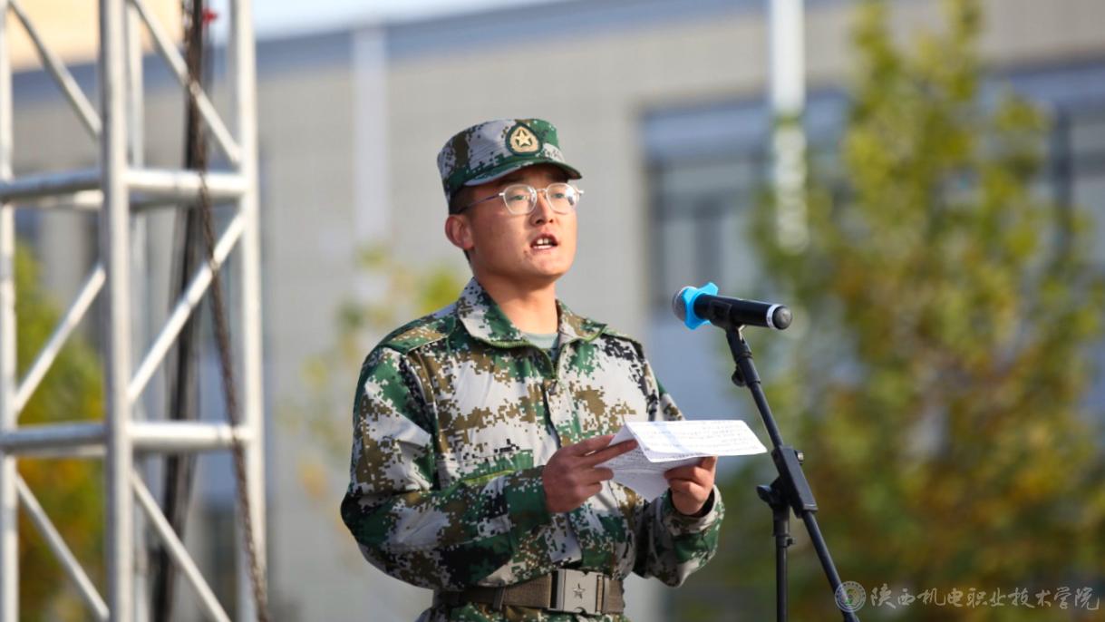 智能制造学院20机电技术4班张禧亮同学代表所有新生发言。他表达了对学院领导、老师和教官的衷心感谢,同大家分享在军训中的收获与成长,并倡议大家在今后的大学生活中,努力学习,提高自己的实践能力,做适应社会发展的复合型人才,做担当民族复兴大任的时代新人。