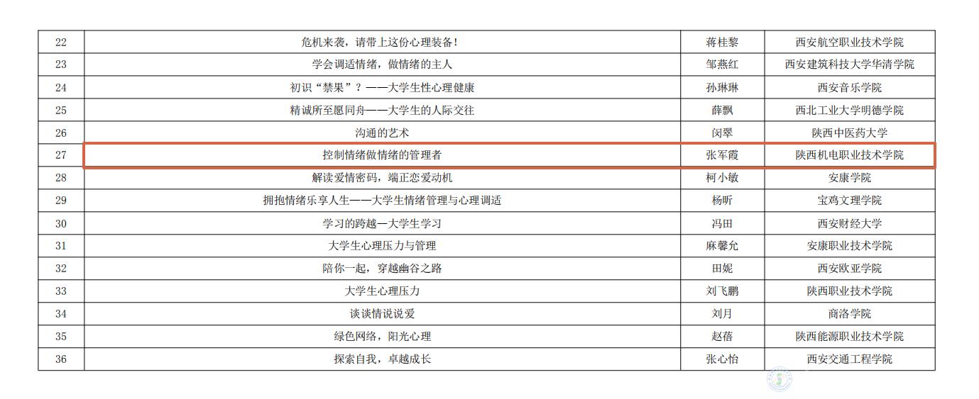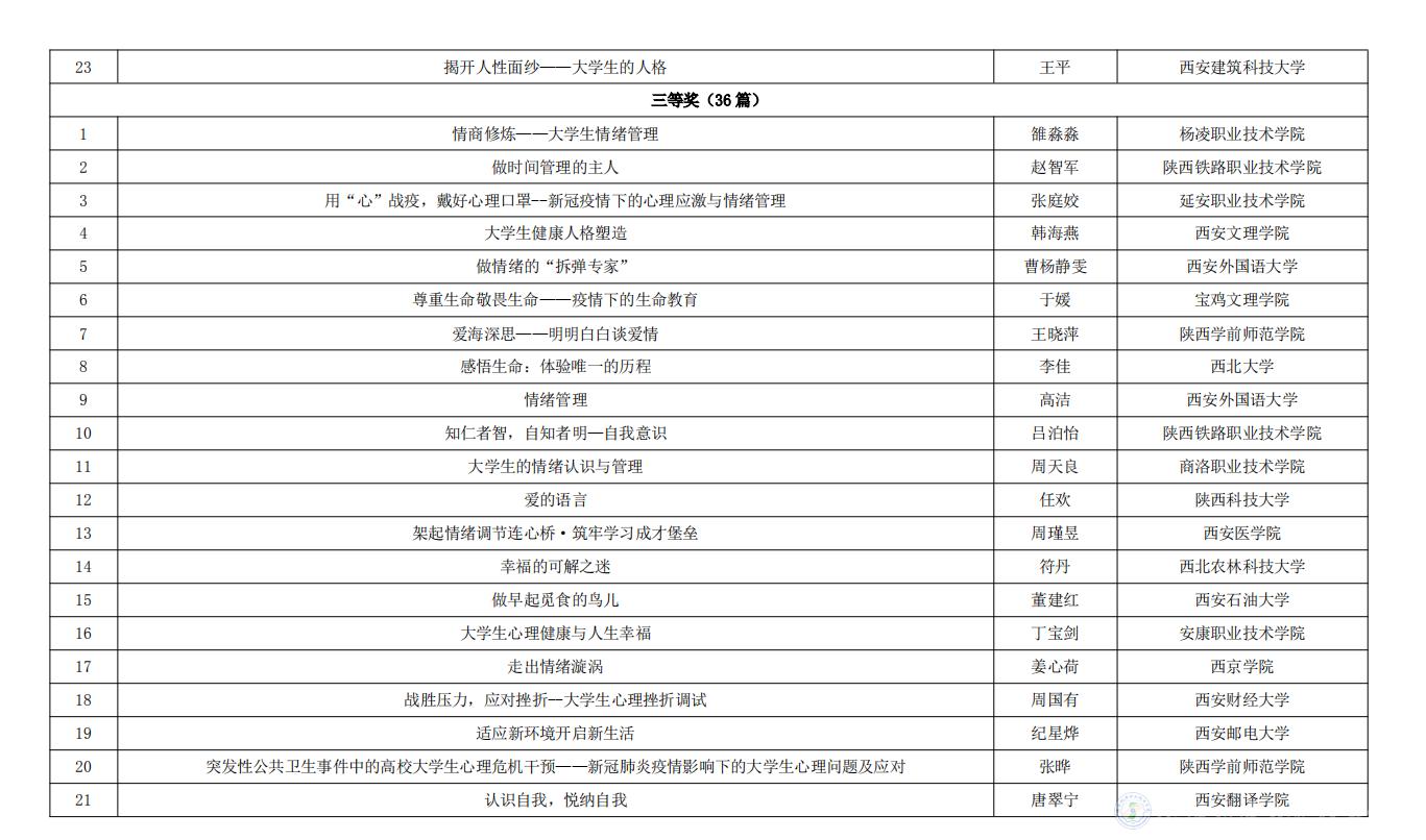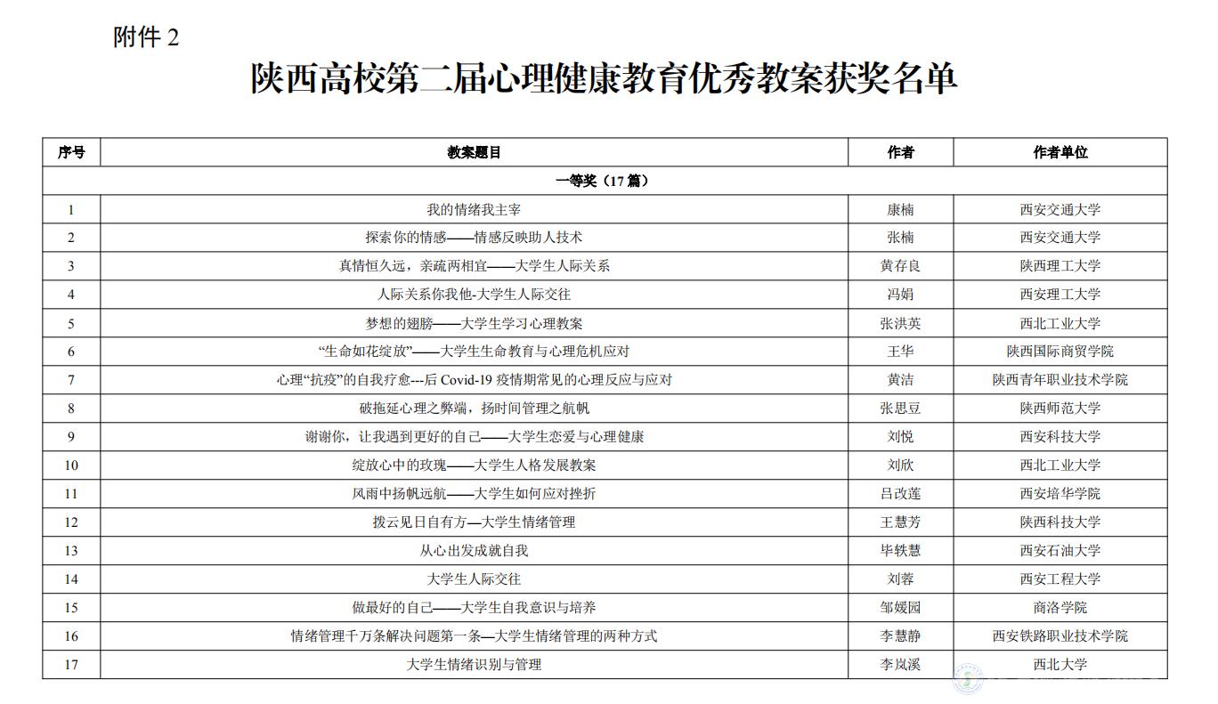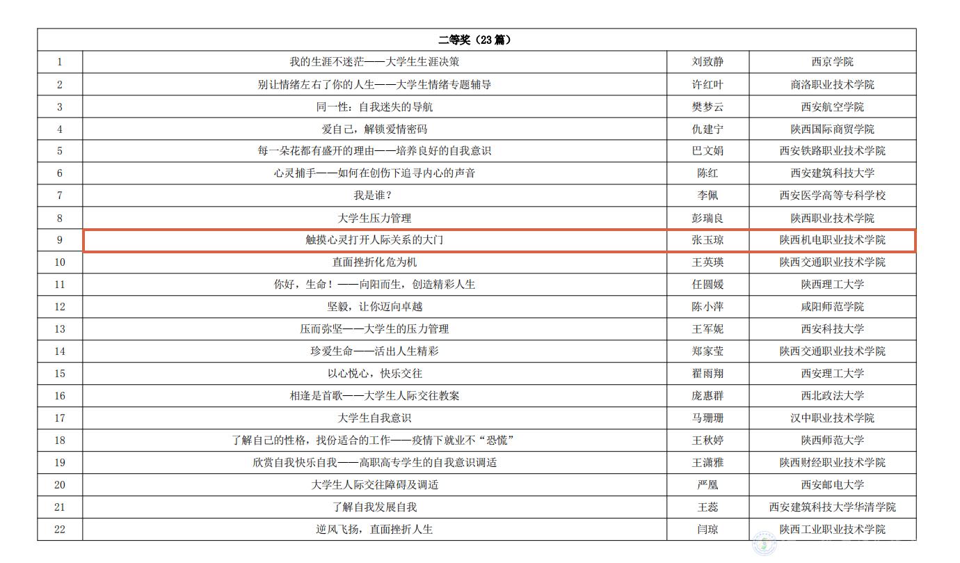 BEAT365官网参加陕西省委教育工委举办的第五届“阳光护航”心理育人宣传季实践系列活动,在第二届心理健康教育优秀教案评选活动中我校教师张玉琼所作题目为《触摸心灵打开人际关系的大门》的教案获得了二等奖、张军霞所作题目为《控制情绪做情绪的管理者》的教案获得了三等奖。