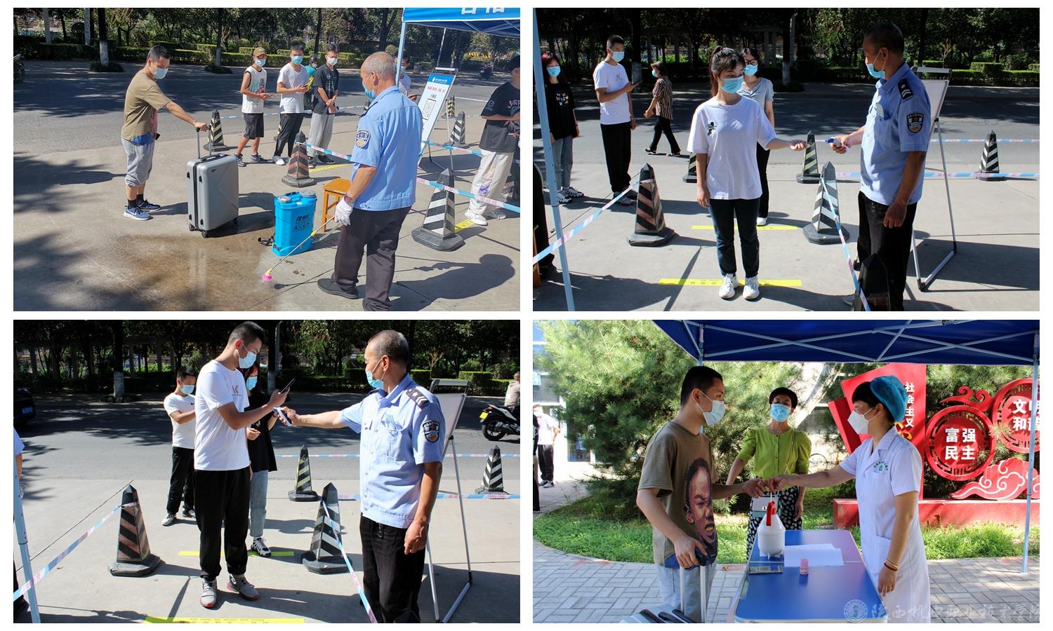 宝福路校区校门口设省内学生和省外学生返校两条通道,通道内设置1.0米间距分隔线,学生按照队列分隔和间距分隔排队接受进校检查。