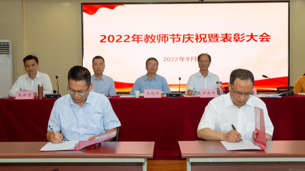 秋澄景清,硕果馥郁,9月9日下午,庆祝第三十八个教师节暨表彰大会在宝福路校区汽车机电大楼四楼视频会议室隆重举行。党委书记伊逊智、党委副书记、院长向纪明,党委副书记、纪委书记齐晓军,党委副书记、副院长张琴,党委委员、副院长张克,副院长邓新治、张新堂,党委委员、院长助理赵争东出席大会,人事处、宣传部、教务处、各教学部门负责人及受表彰教师代表、新入职教师参加会议,会议由党委副书记、院长向纪明主持。
