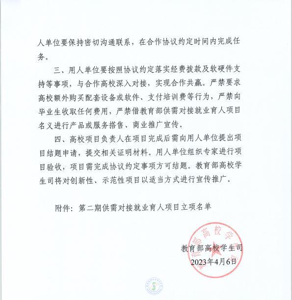 4月6日,教育部高校学生司印发了《关于公布第二期供需对接就业育人项目立项名单的通知》(教学司函〔2023〕6号)。其中,我校与浙江吉利控股集团有限公司、杭州海康威视数字技术股份有限公司、广联达科技股份有限公司等3家企业的定向人才培养培训项目获批。这是我校首次参加并获批教育部供需对接就业育人项目,也是我校高度重视产教融合、校企合作的重要成果。
