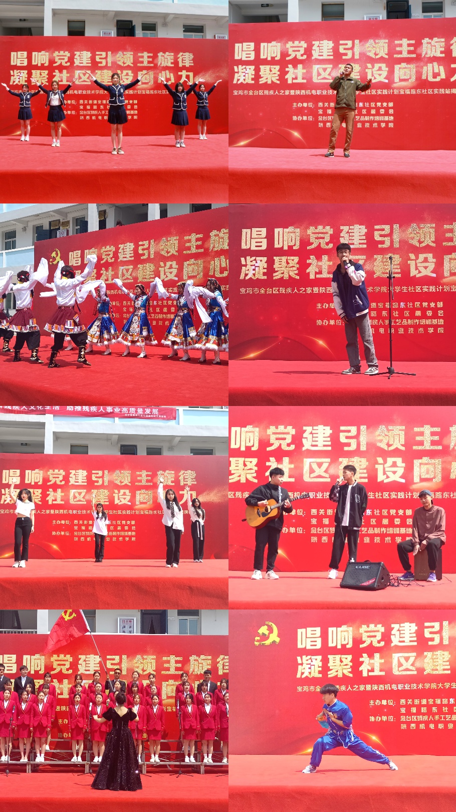 仪式上,王世鹏、张丽华、杨鹏、孟发军、赵兰、巨峰共同为BEAT365官网大学生社区实践计划宝福路东社区实践站揭牌。随后,我校大学生带来了形式多样、丰富多彩的文艺汇演。歌曲《唱支山歌给党听》、《至少还有你》、舞蹈《yes OK》、《锅庄舞》、《相亲相爱》、武术表演、吉他演奏等节目展现了我校青年大学生朝气蓬勃、锐意进取、充满激情的精神面貌。文艺汇演表演形式新颖,内容丰富,处处洋溢着青春的活力。现场气氛热烈、高潮迭起,精彩的演出和忘我的投入赢得了全场一次次热烈的掌声。