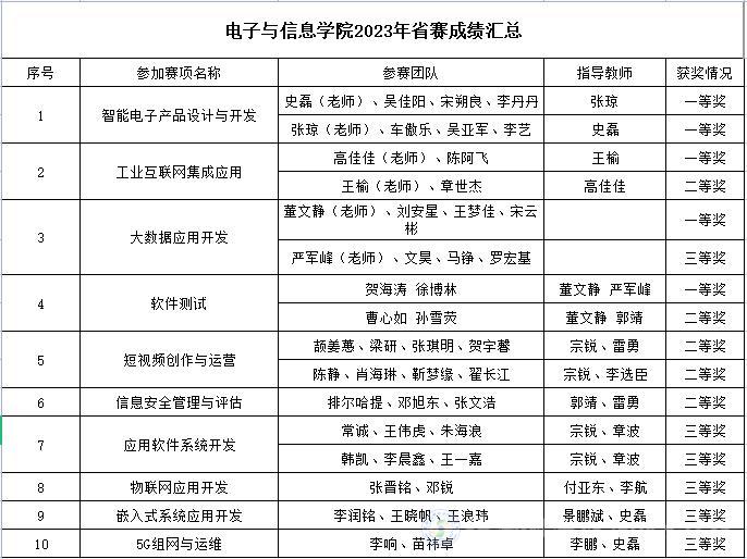 2023年高职院校技能大赛省赛已落下帷幕,电子与信息学院组织师生参加本次省赛十三个赛项比赛,部分赛项为首次师生共赛形式,在比赛过程中师生相互配合,展示了良好的职业素养和技术技能,发挥了默契的团队协作精神,最终我院选手共获得一等奖5项、二等奖5项、三等奖6项的好成绩!