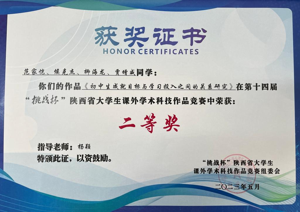 5月20日下午,第十四届“挑战杯”陕汽集团陕西省大学生课外学术科技作品竞赛在长安大学圆满闭幕。我校参赛作品《初中生成就目标与学习投入之间的关系研究》荣获大赛“二等奖”。