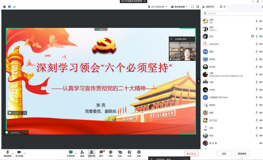 为认真学习宣传贯彻党的二十大精神,7月11日晚,党委委员张克利用腾讯会议为教务党支部、铁道工程学院党支部、交通运输学院党支部全体党员讲了“深刻学习领会六个必须坚持”专题党课。专题党课由教务党支部书记白娟娟主持。