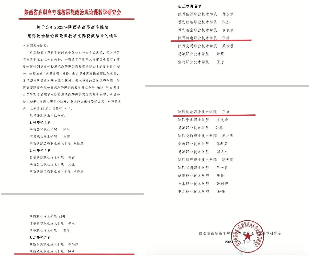 近日,陕西省高职高专院校思想政治理论课教学研究会公布了2023年陕西省高职高专院校思想政治理论课微课教学比赛获奖结果,我校马克思主义学院陈欢老师获二等奖,任婷、王康两位老师获三等奖。