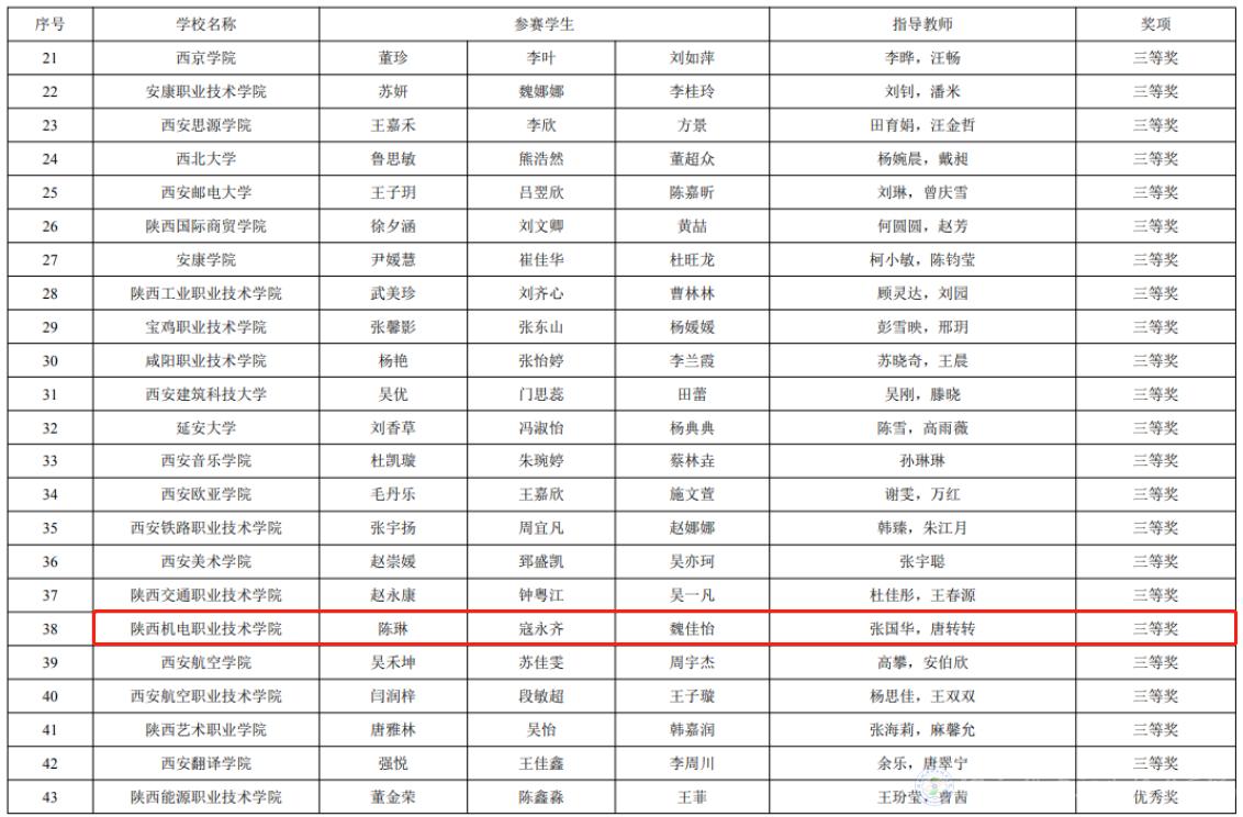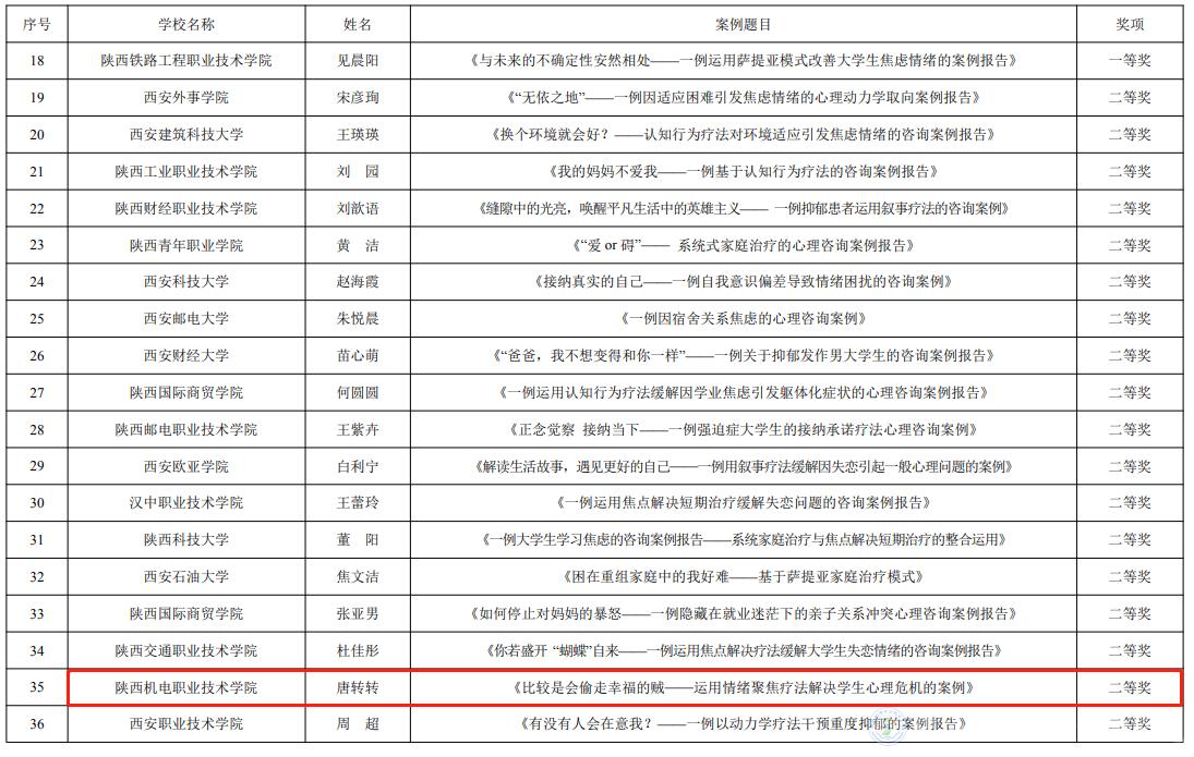 我校心理中心专职教师唐转转的参赛作品《比较是会偷走幸福的贼——运用情绪聚焦疗法解决学生心理危机的案例》荣获第九届陕西高校心理健康教育优秀咨询案例二等奖;心理中心兼职教师张玉琼的参赛作品《风雨过后 方是彩虹——体验压力与挫折》荣获第五届陕西高校心理健康教育优秀教案二等奖;心理中心专职教师张国华、唐转转指导的学生代表队荣获第六届陕西高校大学生心理健康科普知识竞赛暨心理素质拓展运动嘉年华活动三等奖。