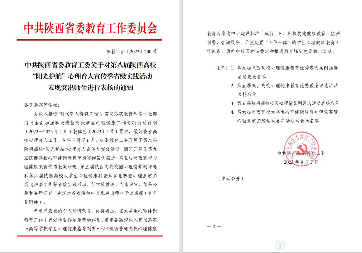 近日,由中共陕西省委教育工委组织开展的第八届陕西高校“阳光护航”心理育人宣传季省级实践活动获奖作品结果公布。我校共有三项获奖,其中,二等奖2项,三等奖1项。