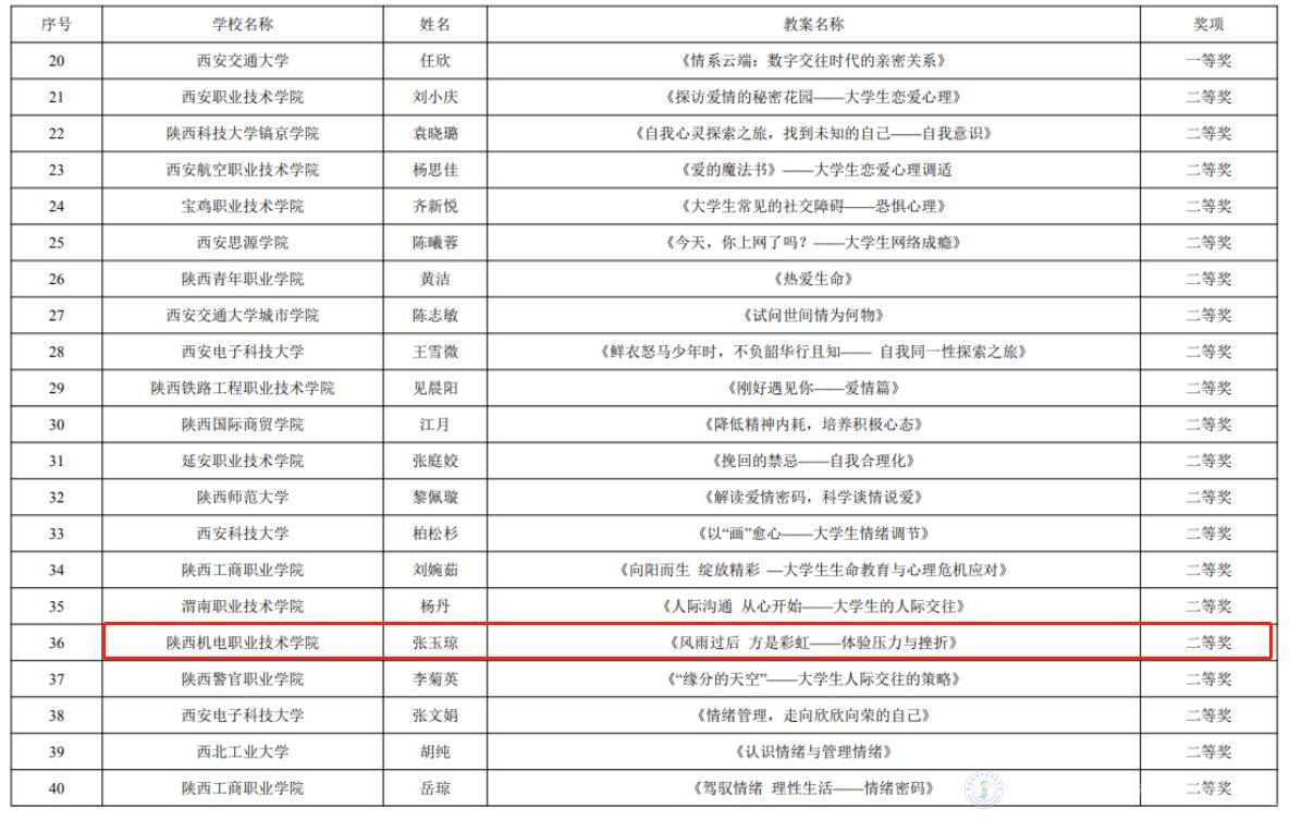 荣获第五届陕西高校心理健康教育优秀教案二等奖