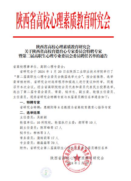 第二届陕西省高职心理专业委员会换届选举大会暨陕西省高职院校2024年心理育人工作论坛于1 月20 日在陕西工业职业技术学院举行,陕西省高校心理素质教育研究会会长郑林科,陕西工业职业技术学院党委书记惠朝阳,党委副书记贺天柱等领导参加会议。我校党委学工部部长、学生处处长王建斌,心理教育