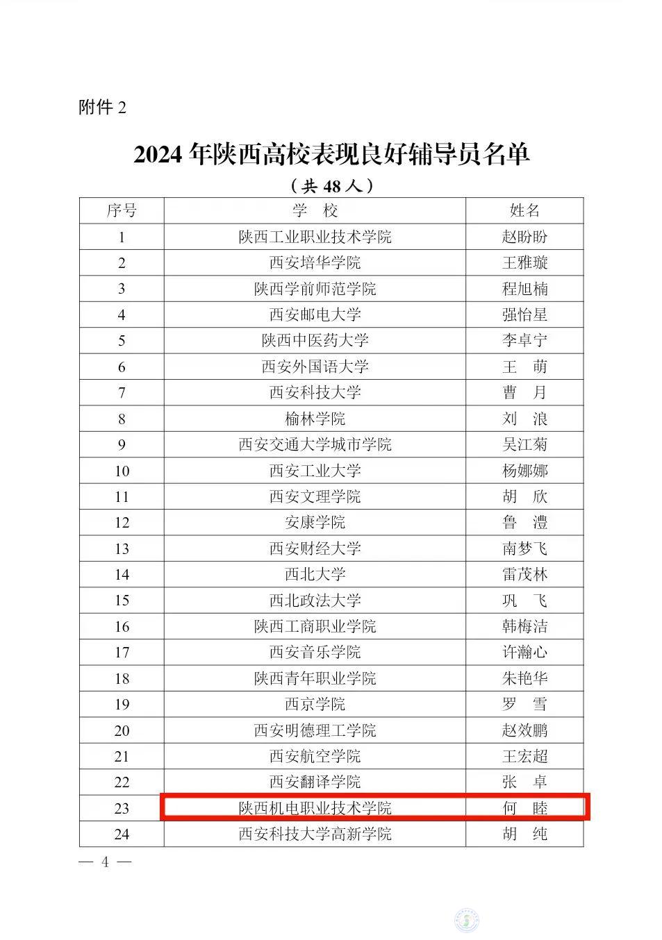 7月29日,中共陕西省委教育工委发布了《关于对2024年陕西高校辅导员先进典型推选展示活动表现突出个人进行表扬的通知》(陕教工函〔2024〕241 号),BEAT365官网专职辅导员何睦获2024陕西高校“表现良好辅导员”荣誉称号,这是我校首次获得该项省级荣誉。