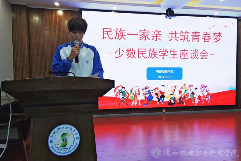 随后,少数民族学生代表24机电技术8班黎帅进行发言。他分享了自己入校以来在学习和生活中的经历与感悟,表达了对学校、学院的感激之情以及对未来的美好期许。