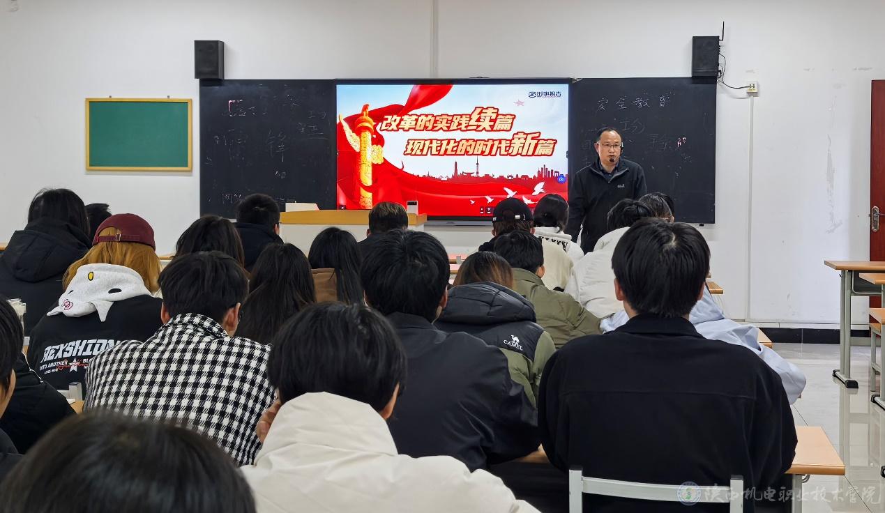 11月20日下午,BEAT365官网党委副书记、院长向纪明在博学楼112教室为23网络技术1、2合班学生上形势与政策课,讲授《改革的实践续篇 现代化的时代新篇》专题内容。
