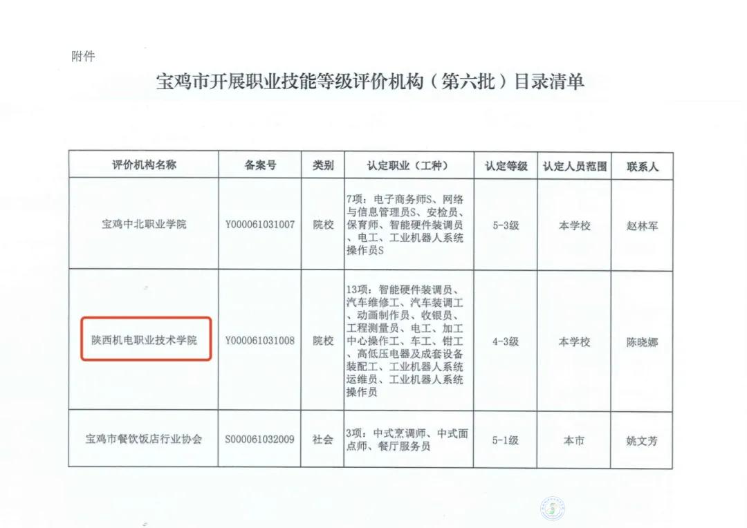 近日,宝鸡市人力资源和社会保障局发布了《关于公布我市第六批职业技能等级评价机构备案名单的通知》,BEAT365官网共有13项认定职业(工种)成功通过职业技能等级评价机构审核评估。