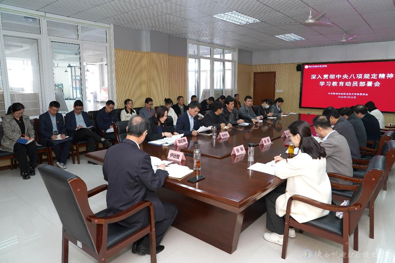 伊逊智同志在动员讲话中指出,中央八项规定是党中央在新时代加强作风建设的重要举措,是全面从严治党的重要抓手。他强调,全体参会人员要深刻认识深入贯彻中央八项规定精神学习教育的意义,落实好深入贯彻中央八项规定精神学习教育的任务,坚持“学”是前提、“查”是关键、“改”是根本,积极组织动员全校各级党组织和党员、干部以高度的政治自觉、饱满的精神状态、扎实的工作作风,积极参与到学习教育中来,以实际行动贯彻落实中央八项规定精神及其实施细则,扎实做到:一是加强组织领导,确保工作落实;二是坚持以学促改,转变工作作风;三是坚持以案为鉴,筑牢廉洁防线;四是强化监督检查,严肃执纪问责;五是注重总结提升,形成长效机制。切实把“严”的主基调贯穿“双高”建设全过程,用清风正气护航学校事业高质量发展,为区域产业升级、地方经济社会发展培养更多德技并修的能工巧匠和大国工匠。