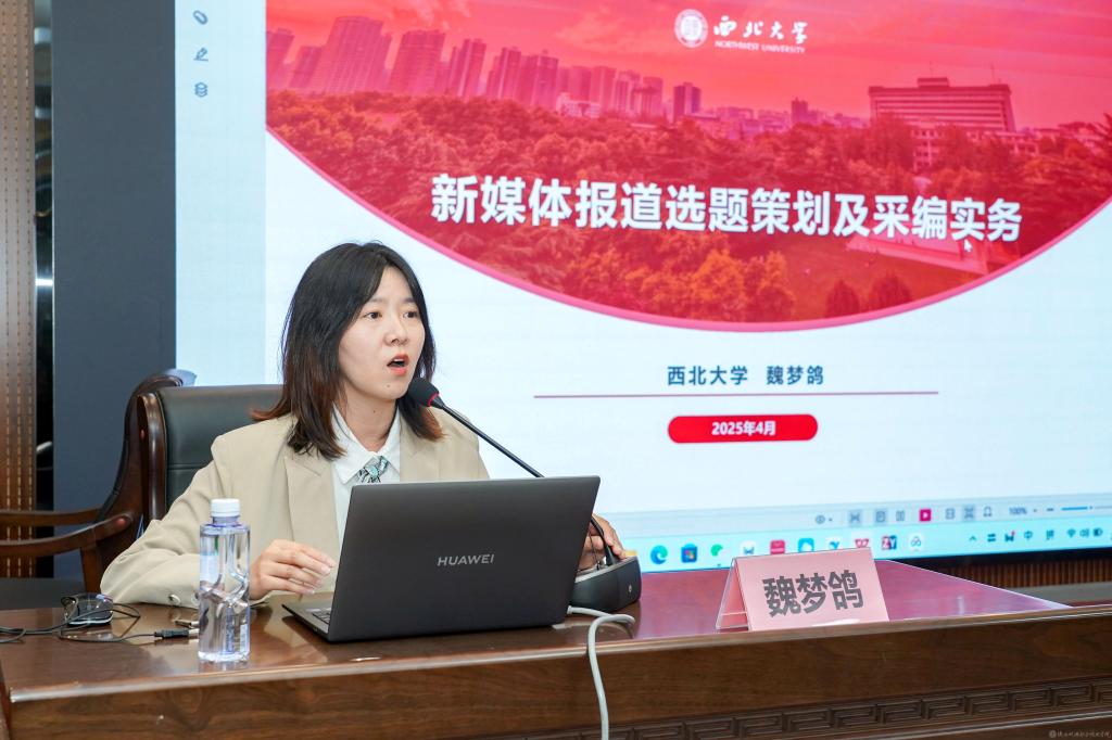 魏梦鸽以《新媒体报道选题策划及采编实务》为题,围绕守正、创新、进阶、提升、素养五个方面展开,从新闻选题从哪里来,到硬新闻、软新闻如何写作;从标题如何一分钟定住读者,讲到微信公众号的编辑排版技巧。同时,她还通过多个“10万+”微信案例,为全体教师通讯员、新媒体中心学生带来了一堂生动实际的分享。