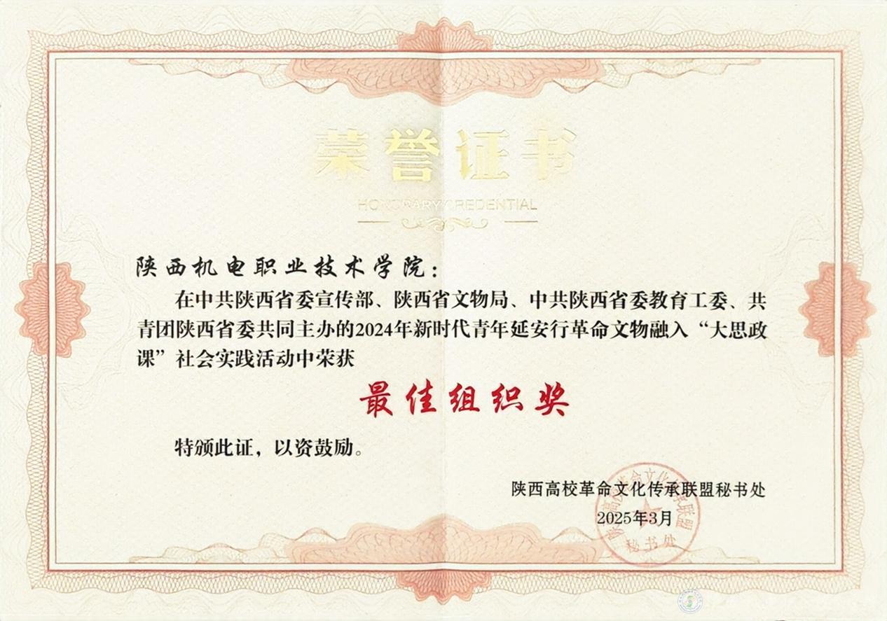会上,陕西高校革命文化传承联盟公布了新时代青年延安行革命文物融入“大思政课”社会实践活动优秀团队表彰名单,我校在中共陕西省委宣传部、陕西省文物局、中共陕西省委教育工委、共青团陕西省委共同主办的2024年新时代青年延安行革命文物融入“大思政课”社会实践活动中荣获“最佳组织奖”。