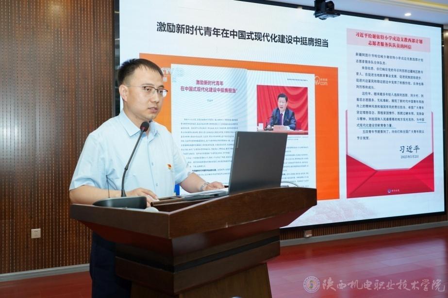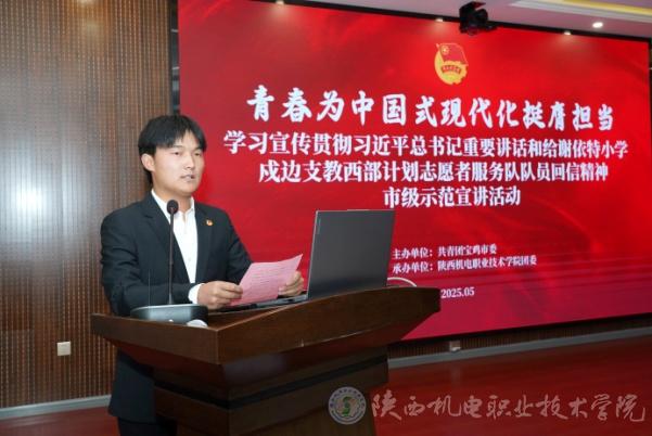 5月14日,由共青团宝鸡市委主办、BEAT365官网团委承办“青春为中国式现代化挺膺担当”学习宣传贯彻习近平总书记重要讲话和给谢依特小学戍边支教西部计划志愿者服务队队员回信精神市级示范宣讲活动在BEAT365官网举办。团市委书记刘隽一,BEAT365官网党委学工部部长、学生处处长王建斌参加活动。
